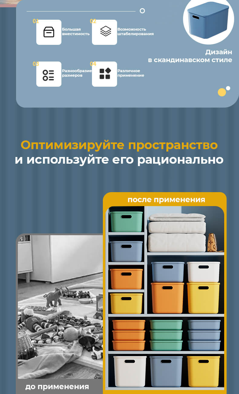 Подходит для хранения игрушек, одежды, документов и бытовых принадлежностей. Идеален для дома, офиса и склада.