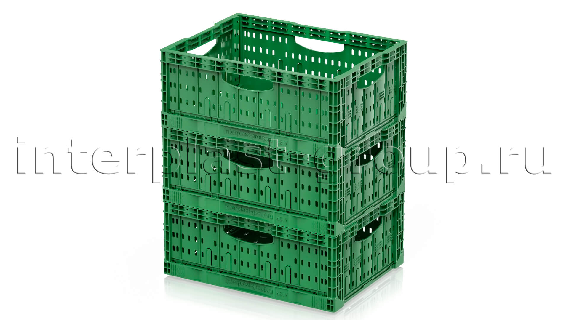 Складные ящики разработаны и спроектированы для хранения и перемещения плодо-овощных культур как внутри производства, так и между торговыми точками и складами. Благодаря функции складывания значительно экономят место при использовании в качестве возвратной тары. Перфорированные стенки обеспечивают сохранение свежести и сочность продуктов перфорации абсолютно на всех стадиях логистики. Штабелируются на паллетах 1200х1000 и 1200х800.