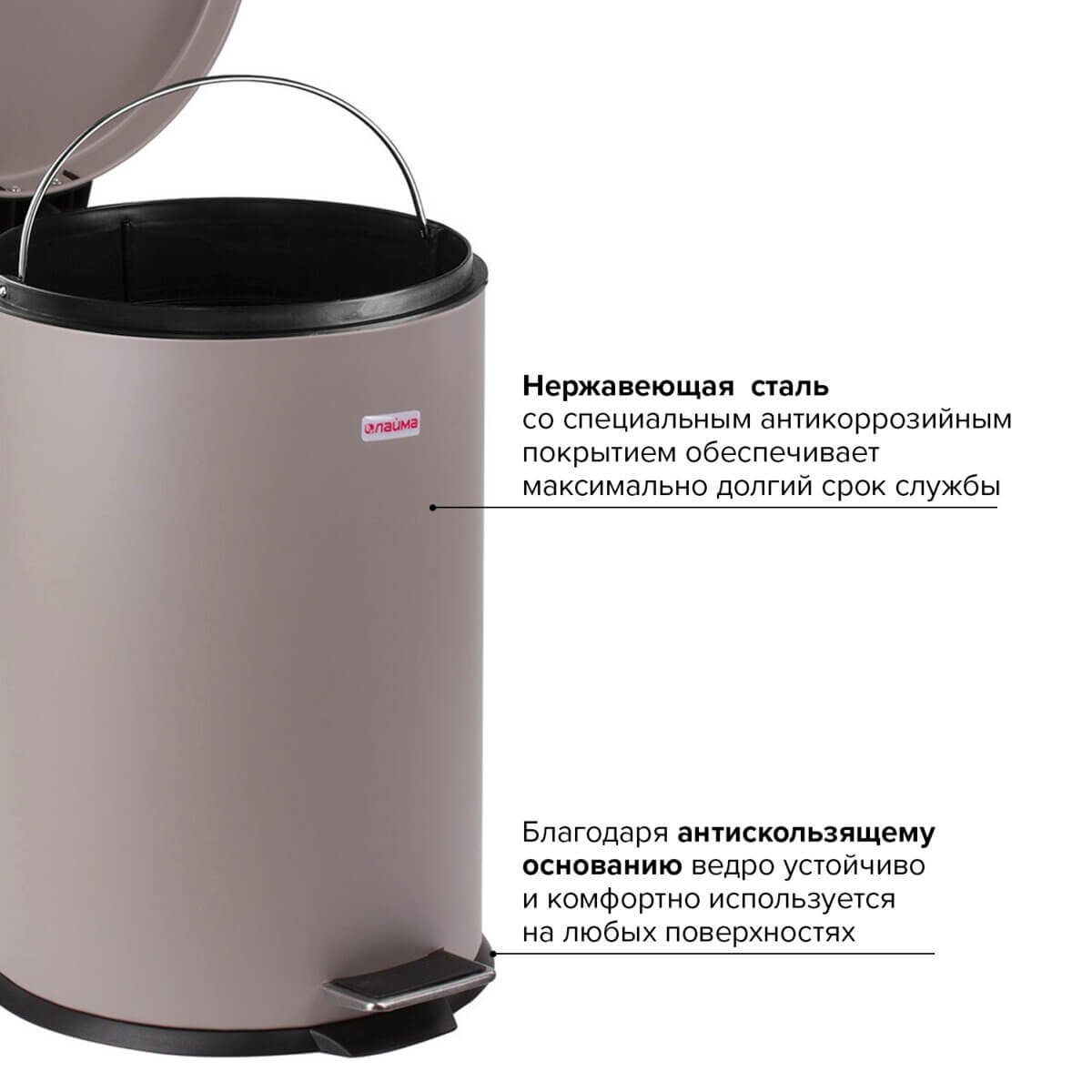 Внутреннее съемное ведро из прочного пластика снабжено удобной рукояткой для легкости выноса мусора. Изготовленное из нержавеющей стали с антикоррозийным покрытием, оно гарантирует долгий срок службы. Прочная конструкция с антискользящим основанием обеспечивает надежность в использовании.
